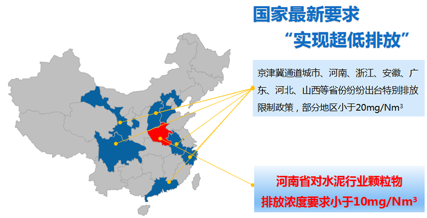 隨著2018年中央實行打贏藍(lán)天保衛(wèi)戰(zhàn)的開始,國家政策對大氣污染排放的要求日益嚴(yán)格,根據(jù)《水泥工業(yè)大氣污染物排放標(biāo)準(zhǔn)》(GB4915-2013)要求,所有水泥企業(yè)自2015年7月1日起窯頭窯尾的粉塵排放濃度限值為30mg/m3,部分地區(qū)小于20mg/Nm3,河南省于2018年已開始執(zhí)行水泥行業(yè)顆粒物排放不得大于10mg/m3的排放標(biāo)準(zhǔn),業(yè)內(nèi)人士普遍認(rèn)為,其他省份執(zhí)行<10mg/m3的排放標(biāo)準(zhǔn)已為期不遠(yuǎn)。