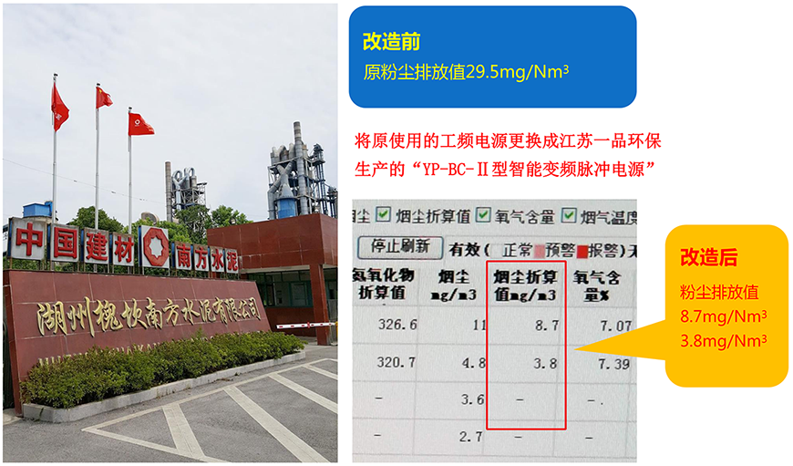 一、達(dá)標(biāo)排放方案:即在必須確保本體各項工況正常的情況下,僅通過將原有電源更換成我公司生產(chǎn)的“智能變頻脈沖電源”,即可達(dá)到<20mg/m3的排放標(biāo)準(zhǔn);并且可實施不停窯改造,改造工期為1-2天,無需顧慮停窯的效益損失。