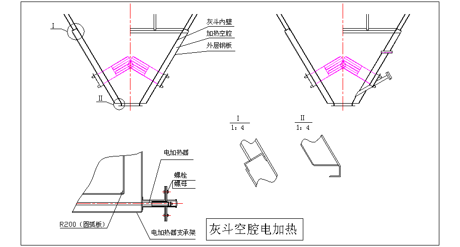 A、 灰斗夾角不小于70°, 相鄰壁交角的內(nèi)側(cè)做成圓弧形,圓角半徑200mm,消滅“死角”。灰斗壁采用振打器,每只灰斗裝一個(gè)可用大錘敲打的在水平方向伸出灰斗加固筋外緣300mm的垂直打擊面,其安裝位置在灰斗捅灰也相鄰的側(cè)壁上。
