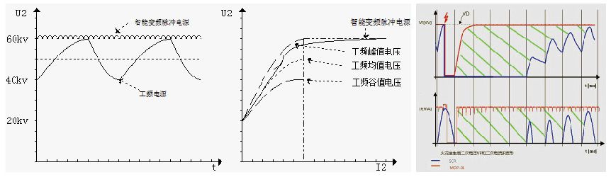 先諾SENIOR智能變頻脈沖電源具有獨特的輸出電壓波紋系數低的特性,純直流供電時的輸出電壓紋波系數通常小于5%,遠低于工頻電源35%-45%的紋波百分比;其閃絡電壓高,運行電流可達普通工頻電源的1.5~3倍,火花后電壓恢復快,使電除塵器能夠保持在接近火花臨界點電壓運行;大幅提高電場電壓和電暈電流,從而增加電場內粉塵的荷電效率和驅進速度,提高綜合除塵效率。