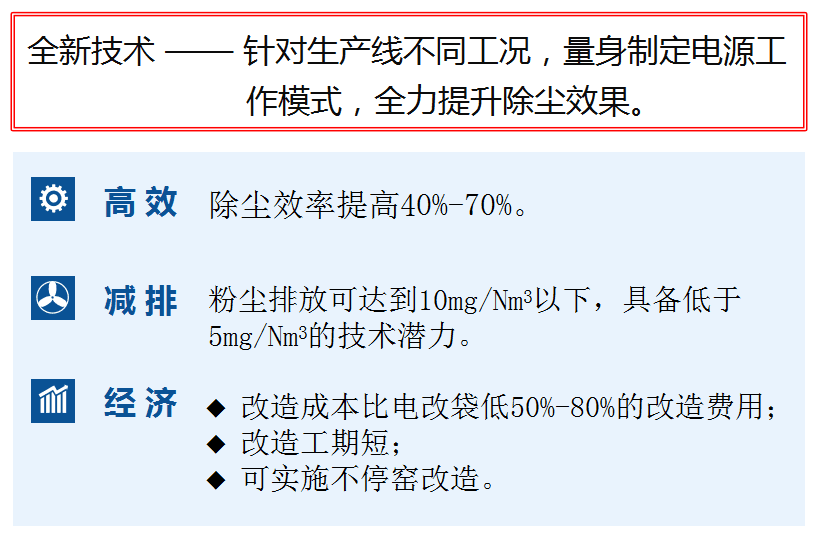 經過多個現場驗證,該方案切實可行,且投資少,改造周期短,長期運行穩定可靠,完全能滿足新的環保要求(確保出口排放<20mg/Nm3,甚至<10mg/Nm3)。